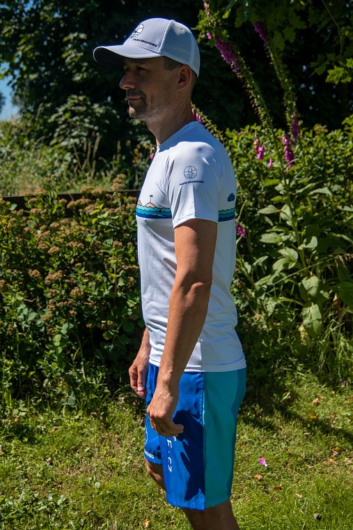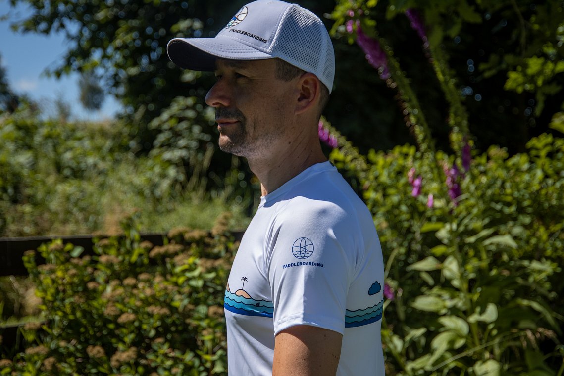 PADDLEBOARDING Cap weiß mit farbigem Logo und Netz auf der Rückseite der Kappe. Das Modell hat eine strukturierte, feste, sechs-Panel-Krone mit eingenähtem Gummizug, der sich der Kopfform anpasst. Bunte Stickerei auf der Vorderseite. Die Rückwand der Kappe ist atmungsaktiv. Material 100% Polyester.