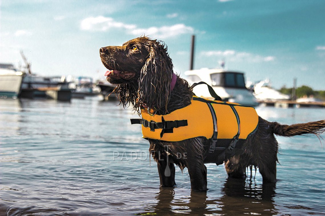 Die Weste hat eine anatomische Form, die das Schwimmen ermöglicht. Die Weste wird mit Nylongurten befestigt. Waschbar bis 30°C.