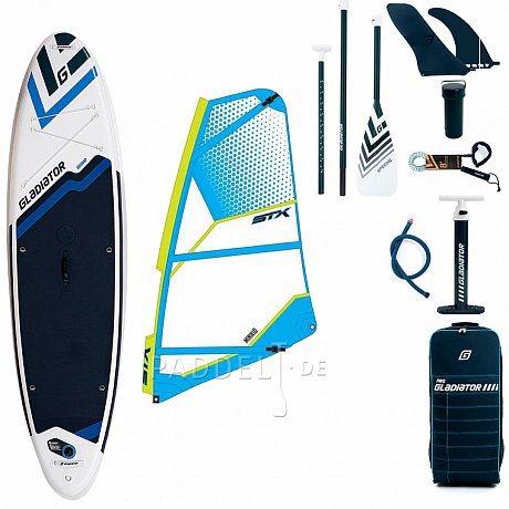 Das GLADIATOR WindSUP 10'7'' + STX Segel nach gewählter Größe + Mastfuß um das Segel zu montieren.