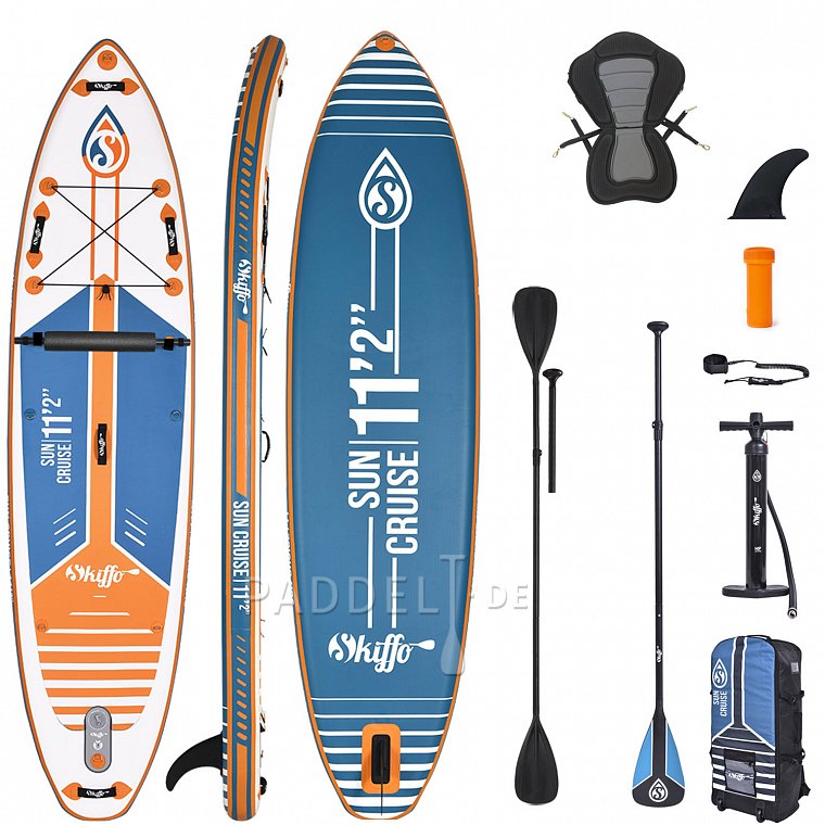 Das SKIFFO SUN CRUISE 11'2''x33''x6'' - ist ein universales aufblasbares SUP-Board für eine breite Anwendung. Es handelt sich um ein 340 cm langes, 84 cm breites und 15 cm hohes SUP-Board,2021 hergestellt mit einer modernen zweillagigen DROP-STITCH-Technologie. Das Volumen beträgt 310 Liter und es wiegt nur 11,6 kg. Es eignet sich auch gut für schwerere Fahrer über 100 kg oder für Fahrten zu zweit. Das Maximalgewicht eines in der Mitte stehenden Fahrers ist 150 kg. Es ist für Anfänger als erstes SUP-Board in die Familie geeignet. Dank der Breite und viel Volumen bietet es eine sehr gute Stabilität. Dank der nach oben geformten Nase ist das Brett auch für leicht welligen und Fließgewässer geeignet. Problemlos können Sie das Board auch zu zweit paddeln. Auf dem SUP wurden 5 Neopren-Griffe angebracht, die für eine gute Handhabung sorgen.