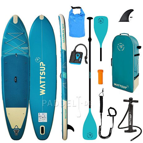 Das WATTSUP Marlin 12'5' ist ein SUP-Board aus der Kategorie "Große Familien-Boards". Das SUP wird im Grundset mit einem 4-teiligen Combo-Paddel geliefert, das sowohl für das Paddeln im Stehen als auch im Sitzen – wie in einem Kajak – geeignet ist. Der Kajak-Sitz ist nicht im Lieferumfang enthalten.
