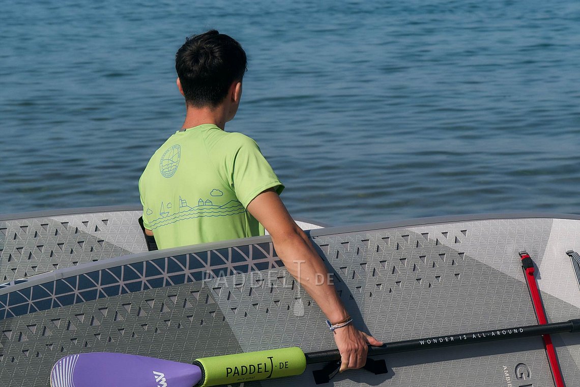 In Kombination mit einer Kappe als Kopfschutz ist das Lycra-T-Shirt ein wichtiger Bestandteil der SUP-Ausrüstung.